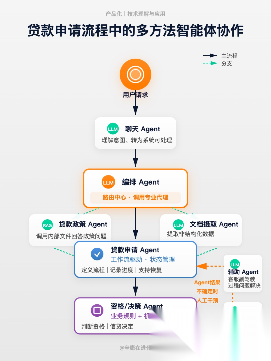 人工干预与决策重试:当决策Agent的结果是“可能”时,流程会转移给人工客服。人工客服在辅助Agent和解释Agent的帮助下解决问题后,流程不是由客服批准贷款,而是通知贷款申请Agent,然后系统会再次重试决策。这保证了即使有人工干预,最终的决策逻辑仍由自动化系统控制。