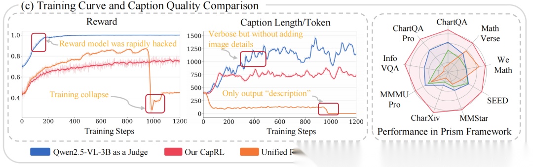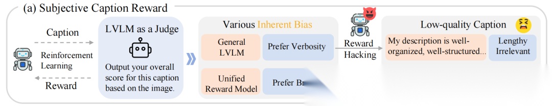 对于该任务,目前主流方案均先通过人工or专精模型给图片集合构建caption再通过SFT让模型拟合图文对样本(通过NTP任务依次预测caption中的每个token),这类方案的缺点是构建高质量caption的成本通常比较高导致不易扩展数据量,另外SFT范式本身就倾向让模型去记忆,导致泛化性比较受限。为了提升模型的泛化性,使用可验证奖励的强化学习(RLVR)是一种很好的选择。但使用这种范式有一个关键问题,那就是如何较好地评估模型产出的caption的质量?(本质是设计奖励模型)。如下图所示,若直接使用通用奖励模型或者通用VLM评估caption跟图片的匹配度,通常会存在reward hacking的问题。