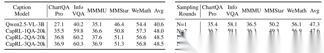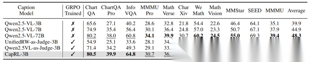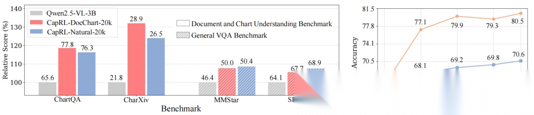 - 即使QA训练数据仅限于DocChart或者自然图片,CapRL-3B的caption质量相比baseline也有明显的提升;