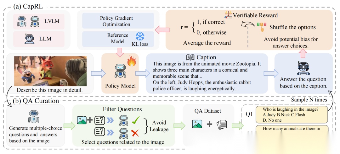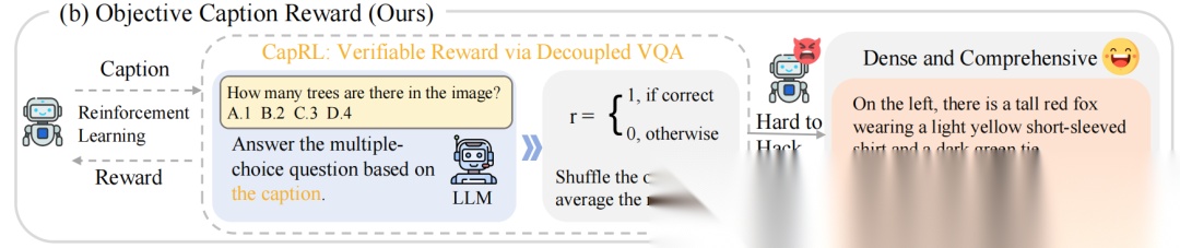 CapRL提出创新方法,将半开放的图像描述评估转为封闭式评估,即通过测试描述能否帮助无视觉能力的LLM正确回答相关问题来评估质量。该方法使用RLVR范式训练,构建高质量图文问答对数据集,实验证明能显著提升图像描述质量,且将其数据用于预训练可有效提升多模态大模型性能。