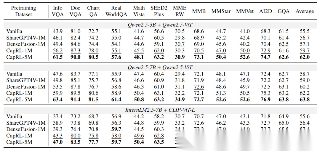 - 维度3: 将CapRL模型所生产的caption数据当做通用多模态大模型的预训练数据,是否能提升大模型的整体效果?具体结果如下所示: