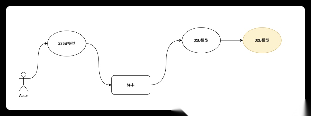 先找一批样本,用235B的大模型去处理;拿到大模型处理的结果,去微调一个32B的小模型,最后就得出一个具备了大模型思路的小模型,不过,这种小模型也限制了只能处理某一个具体的场景(训练的场景)。