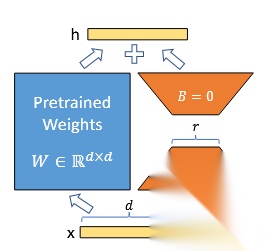 对于预训练的权重矩阵,对其更新进行低秩分解, 从而,其中,且秩。在训练过程中,被冻结,不接收梯度更新,而和包含可训练的参数。对于前向传播,LoRA将其修改为: