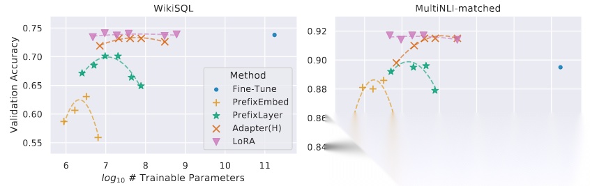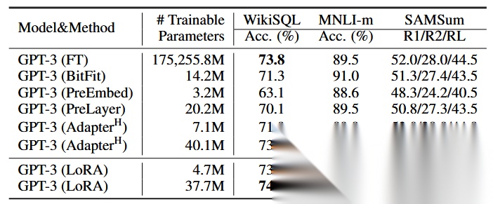 - GPT-3 175B扩展实验:以4.7M参数(全微调0.01%)在WikiSQL、MNLI等任务中匹配或超越全微调,提升部署灵活性,内存需求降低3倍且无推理延迟。