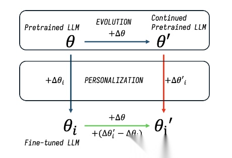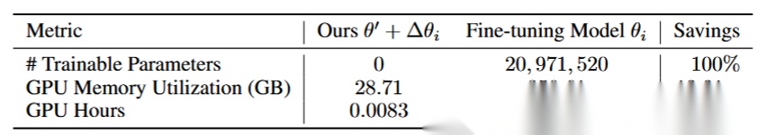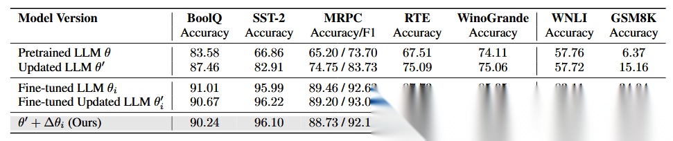 换句话说,可以将先前微调过程中的额外知识直接添加到最新的LLM中,从而以极低的成本取得与基于最新的模型微调得到的模型接近的效果。