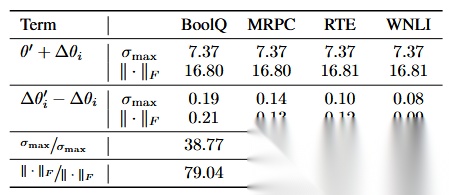 我们声称残差矩阵与朴素更新相比可以忽略不计。证明:首先,回顾第3.2节中的假设,即∆θ′_i和∆θi的秩远小于∆θ的秩。其次,θ′ = θ + ∆θ确保了rank(θ′) ≥ rank(θ)。因此,我们得出结论:残差矩阵的秩远小于朴素更新矩阵的秩。