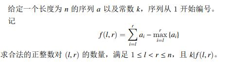 1 #include <bits/stdc++.h> 2 using namespace std; 3 const int N = 1e6 + 10; 4 typedef long long ll; 5 int n, k, a[N]; 6 ll s[N], ans, cnt[N]; 7 void sol(int ql, int qr) { 8 if(ql == qr) { 9 return ; 10 } else { 11 int mid = (ql + qr) >> 1; 12 sol(ql, mid), sol(mid + 1, qr); 13 int l, r, mxl, mxr; ll sl, sr, sum; 14 l = mid, r = mid + 1, mxl = a[l], mxr = a[r]; 15 sl = 0, sr = a[r] % k; 16 ++ cnt[sr]; 17 while(l >= ql) { 18 mxl = max(mxl, a[l]); 19 sl = (sl + a[l]) % k; 20 while(r + 1 <= qr && mxl >= max(mxr, a[r + 1])) { 21 ++ r; 22 mxr = max(mxr, a[r]); 23 sr = (sr + a[r]) % k; 24 ++ cnt[sr]; 25 } 26 if(mxl >= mxr) { 27 ll qu = -sl + mxl; 28 qu = (qu % k + k) % k; 29 ans += cnt[qu]; 30 } 31 -- l; 32 } 33 sum = 0; for(int i = mid + 1 ; i <= qr ; ++ i) cnt[sum = (sum + a[i]) % k] = 0; 34 l = mid, r = mid + 1, mxl = a[l], mxr = a[r]; 35 sl = a[l] % k, sr = 0; 36 ++ cnt[sl]; 37 while(r <= qr) { 38 mxr = max(mxr, a[r]); 39 sr = (sr + a[r]) % k; 40 while(l - 1 >= ql && mxr > max(mxl, a[l - 1])) { 41 -- l; 42 mxl = max(mxl, a[l]); 43 sl = (sl + a[l]) % k; 44 ++ cnt[sl]; 45 } 46 if(mxr > mxl) { 47 ll qu = -sr + mxr; 48 qu = (qu % k + k) % k; 49 ans += cnt[qu]; 50 } 51 ++ r; 52 } 53 sum = 0; for(int i = mid ; i >= ql ; -- i) cnt[sum = (sum + a[i]) % k] = 0; 54 } 55 } 56 int main() { 57 freopen("interval.in", "r", stdin); 58 freopen("interval.out", "w", stdout); 59 scanf("%d%d", &n, &k); 60 for(int i = 1 ; i <= n ; ++ i) scanf("%lld", &a[i]); 61 sol(1, n); 62 printf("%lld\n", ans); 63 }