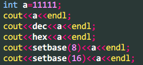 5)按进制输出,dec为十进制,hex为16进制,而也可以通过setbase(n),直接设置n进制,例如: