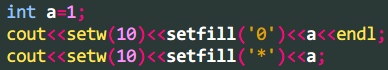 1)设置宽度setw(n),n即为输出固定宽度,默认以空格填充,如果加上setfill('0')即以‘0’为填充,‘’内可改为其他字符,例如: