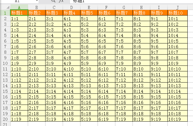 1 procedure TForm1.Button1Click(Sender: TObject); 2 var 3 i, n: Integer; 4 XLS: TXLSReadWriteII5; // 引用XLSReadWriteII5, Xc12DataStyleSheet5, ShellAPI 5 begin 6 XLS := TXLSReadWriteII5.Create(nil); 7 try 8 XLS.Clear; 9 XLS.FileName := ExtractFilePath(paramstr(0)) + 'temp.xls'; 10 for i := 0 to 9 do 11 XLS.Sheets[0].AsString[i, 0] := '标题' + IntToStr(i + 1); 12 for i := 0 to 9 do 13 for n := 1 to 19 do 14 XLS.Sheets[0].AsString[i, n] := IntToStr(i + 1) + ':' + IntToStr(n); 15 16 for i := 0 to 9 do // XLS.Sheets[0].LastCol do // 从第一列到最后一列 17 begin 18 for n := 0 to 19 do // 从第一行到最后一行 19 begin 20 XLS.Sheets[0].Range.Items[i, n, i, n].BorderOutlineStyle := cbsThin; 21 XLS.Sheets[0].Range.Items[i, n, i, n].BorderOutlineColor := 0; // 黑色#0 22 if n = 0 then 23 begin 24 XLS.Sheets[0].Cell[i, n].CellColorRGB := 16744448; // 橘黄#FF8000 25 XLS.Sheets[0].Cell[i, n].FontColor := 16777215; // 白色#FFFFFF 26 end 27 else 28 XLS.Sheets[0].Cell[i, n].CellColorRGB := 16777165; // 杏仁灰#FFFFCD 29 end; 30 XLS.Sheets[0].AutoWidthCol(i); // 每列为自动宽度 31 end; 32 XLS.Write; 33 ShellExecute(0, 'Open', PChar(ExtractFilePath(paramstr(0)) + 'temp.xls') 34 , nil, nil, SW_SHOW); 35 finally 36 XLS.Free; 37 end; 38 end;