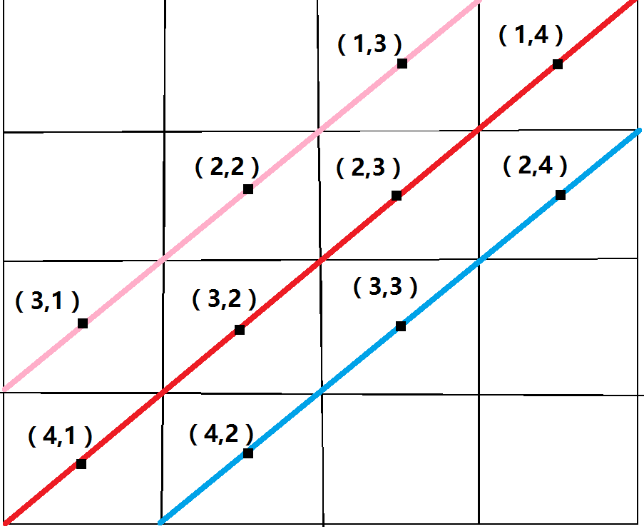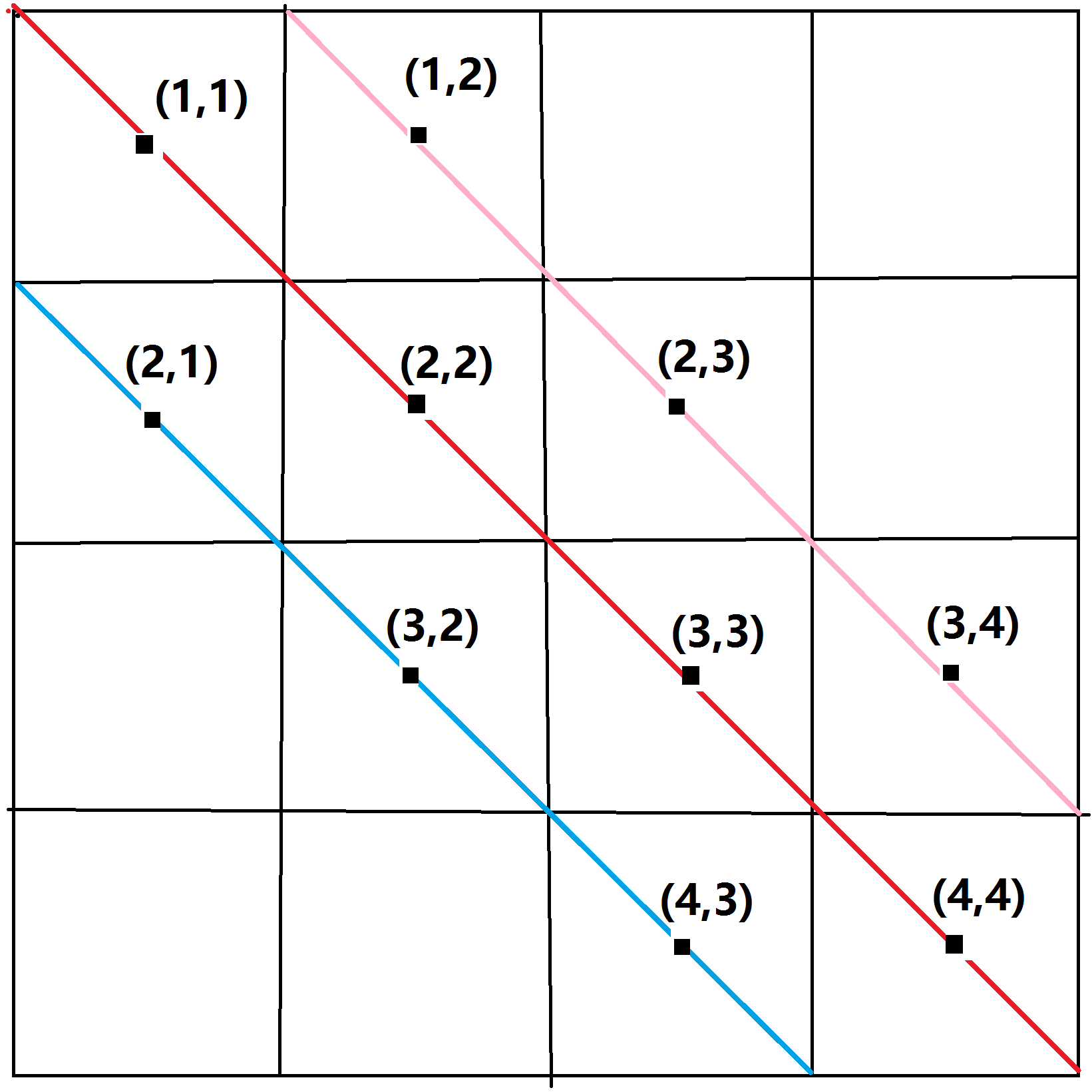 同样的,对于n*n的棋盘,共有2n+1条左斜线,我们可以把向左倾斜的斜线编号为(x-y+n)