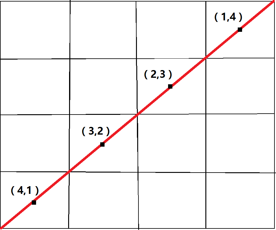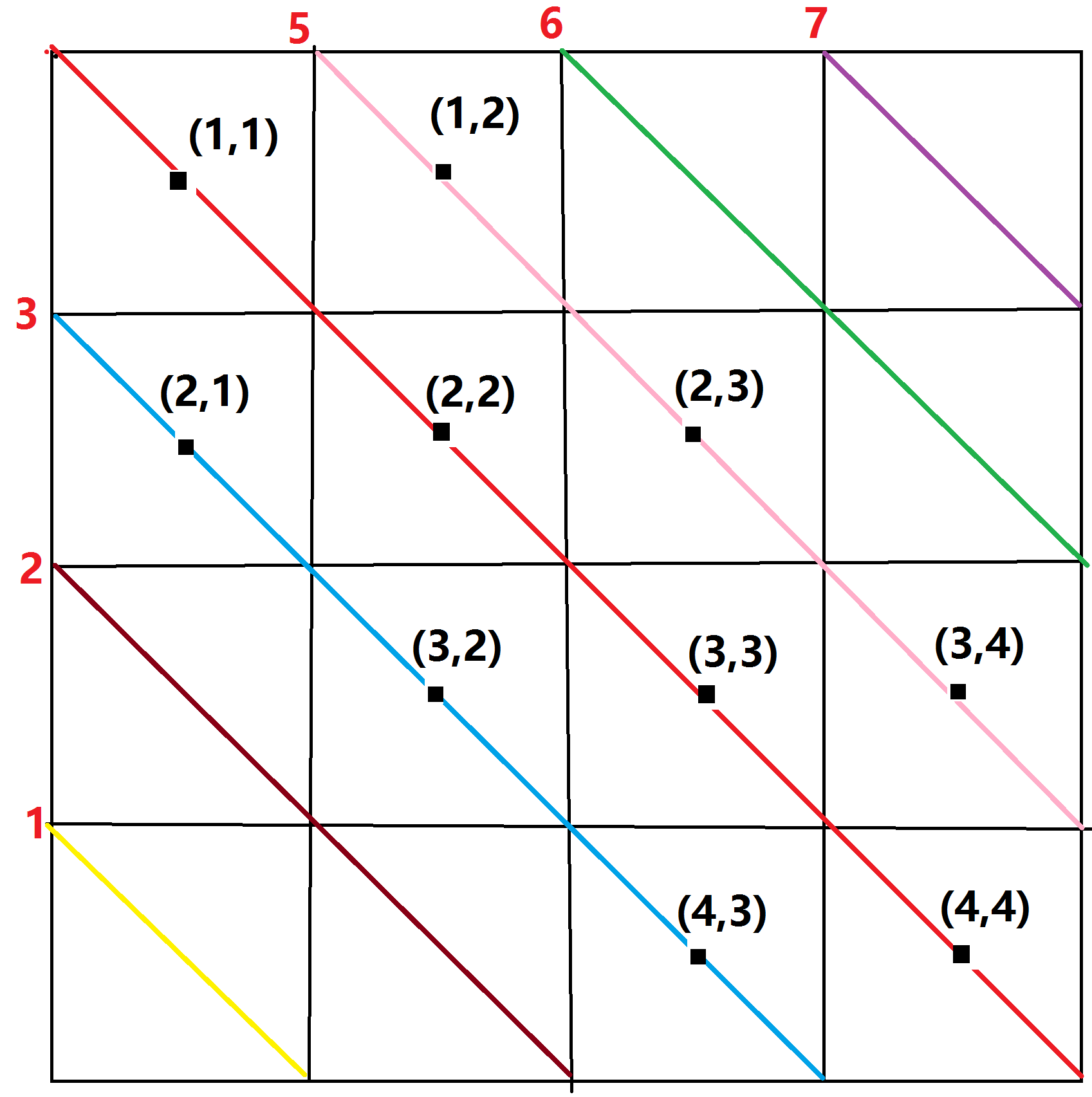 不难看出,在标红的这条向右倾斜的主对角线上点的坐标满足x+y==5