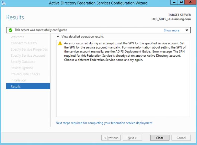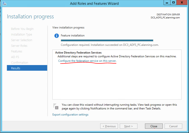 同样在主操作面板Add Roles and Features Wizard中,选择添加ADFS。按照默认下一步,直到出现server roles。 点击安装Active Directory Federation Services。继续所有默认选项,直到安装结束。