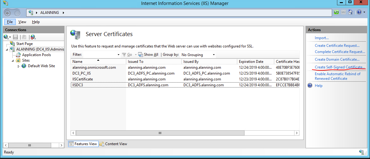 在主操作面板Add Roles and Features Wizard中,选择添加IIS,成功后,进入Internet Information Services Manager中,在右侧选择Create Self-Signed Certificate. 创建好后,就会再列表中展现,右键导出,再局域网中共享,在DC3_ADFS中下载使用。