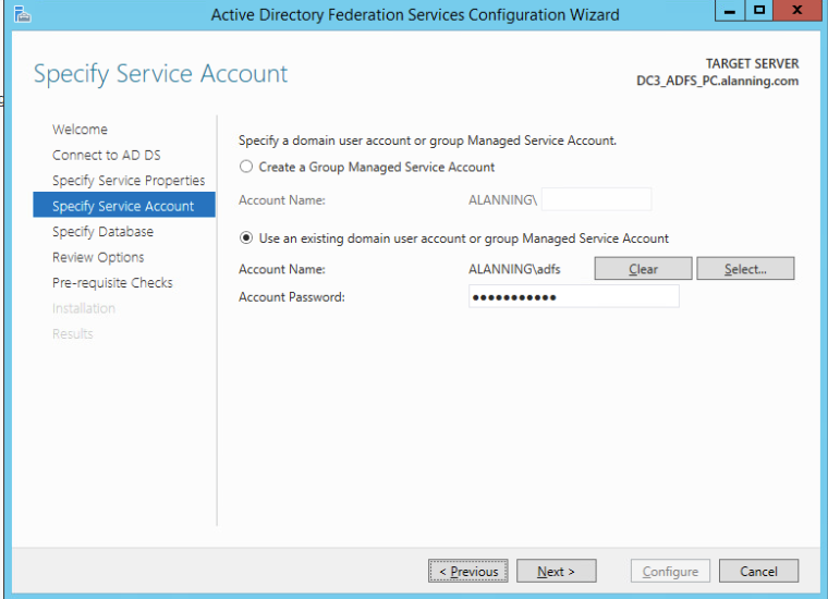 3.Specify Service Account - 选择默认选项(第二个),输入当前用户帐号密码。
