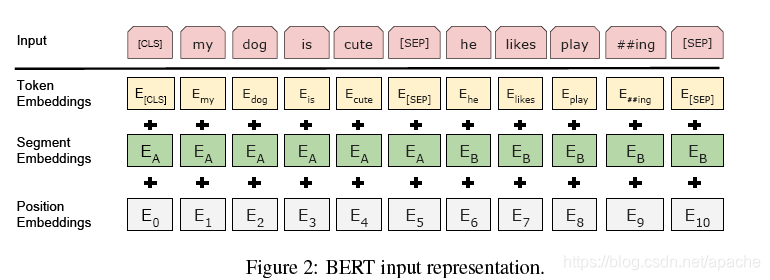 对于给定的分词,其输入表示形式是通过将相应的{分词,分段和位置嵌入}求和来构造的。