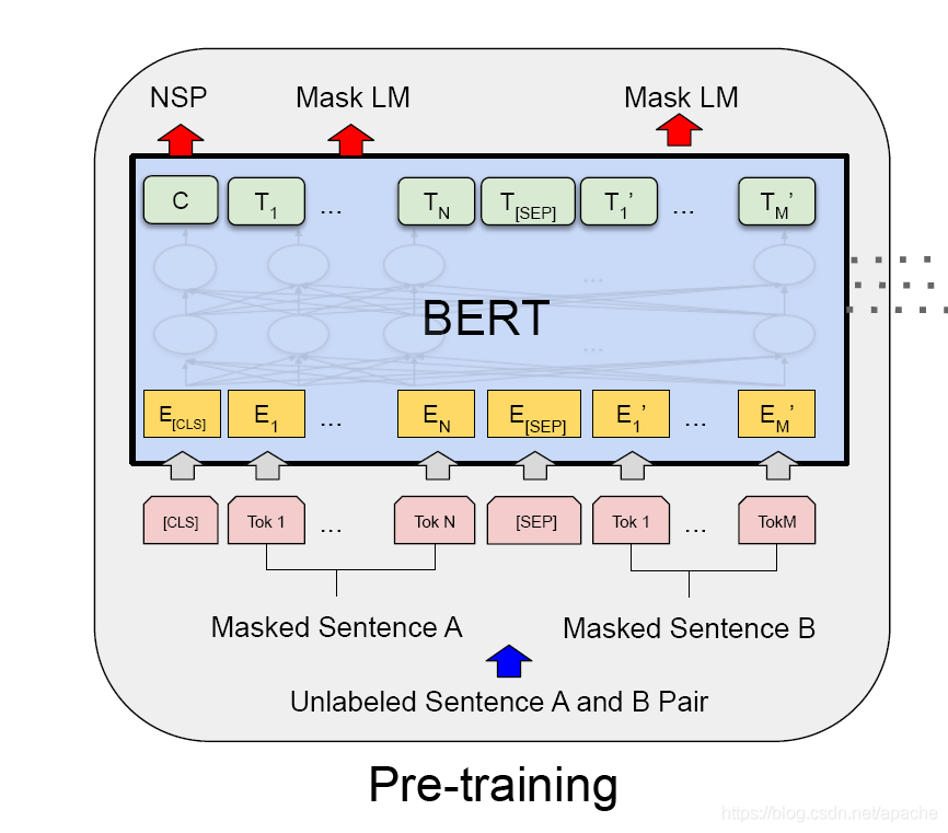 对BERT进行预训练。作为代替,我们使用本节中描述的两个非监督任务对BERT进行预训练。此步骤展示