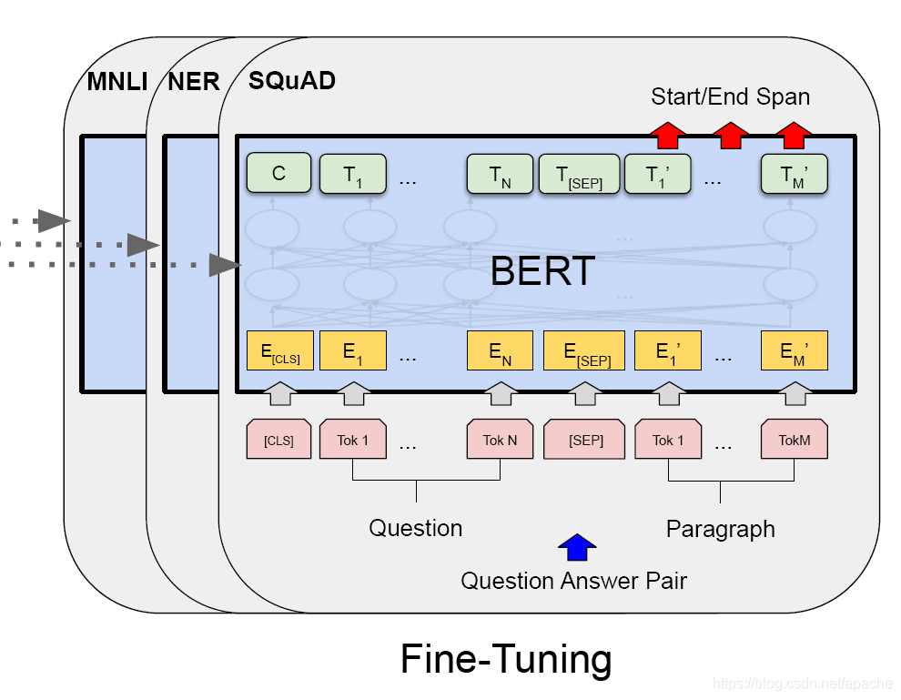 在输入端,来自预训练的句子A和句子B类似于(1)释义中的句子对,(2)蕴含的推断假设文本-前提文本
