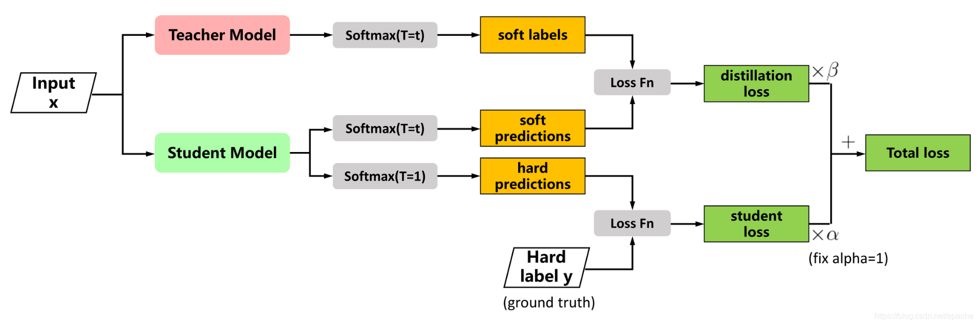 通过充分利用教师的全部分布,此Loss目标函数可产生丰富的培训信号。遵从(Hinton,2015)使用,