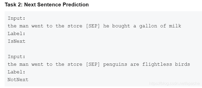 的概率预测为B(标记为 IsNext ),另外50%的概率预测为语料库的随机句子(标记为 NotNext )。