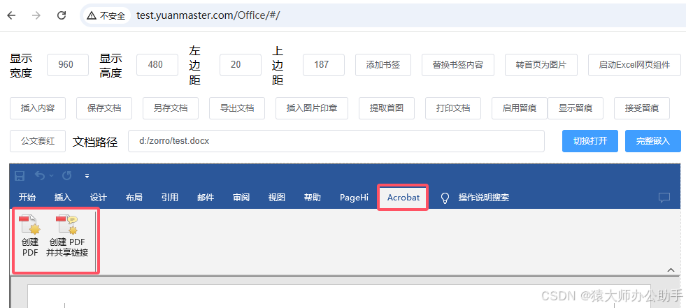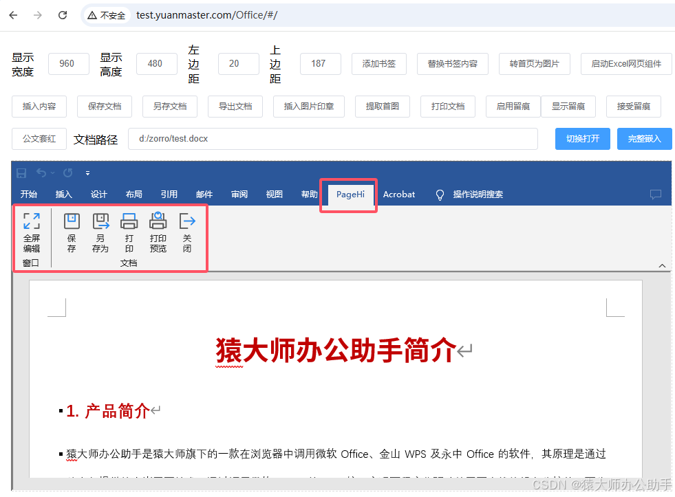 如果想自定义菜单栏及下拉菜单扩展,可以自行开发Office相关插件,猿大师办公助手在把本机OFFICE或者WPS内嵌到网页中会自动显示第三方插件,比如:PAGEHI就是我们开发的第三方Office插件,会自动显示到网页OFFICE窗口内,并且相关功能都是可以用的。