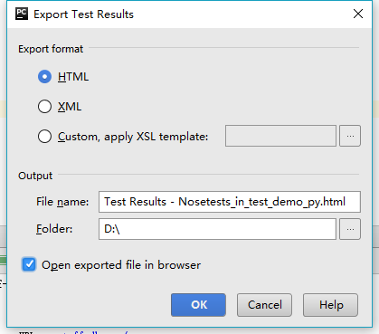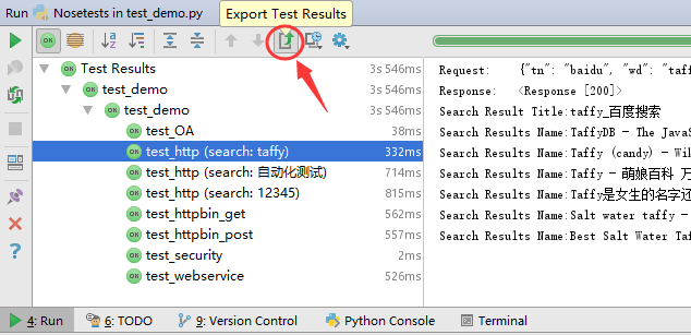 1) 在PyCharm左下方Run窗口Testing toolbar中,选择导出测试结果“Export Test Results”