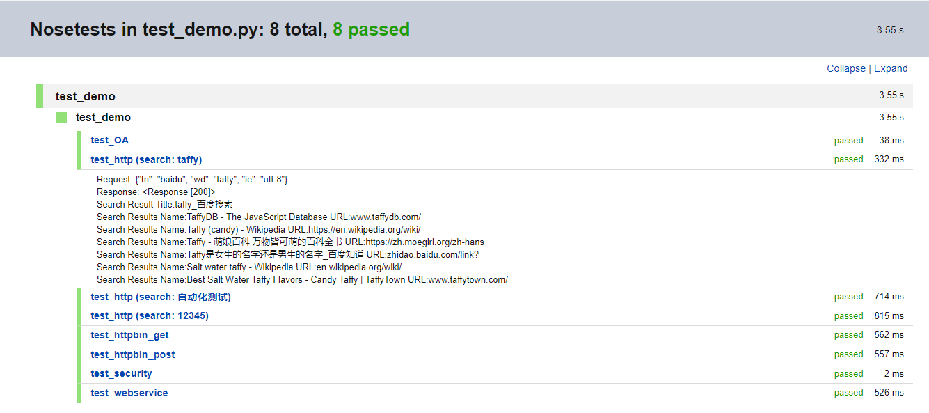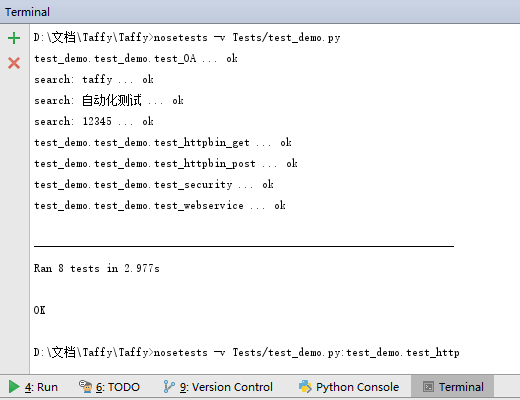 # 执行测试文件test_demo.py $ nosetests -v Tests/test_demo.py # 单独执行测试文件test_demo.py中测试类test_demo下的test_http测试方法 $ nosetests -v Tests/test_demo.py:test_demo.test_http