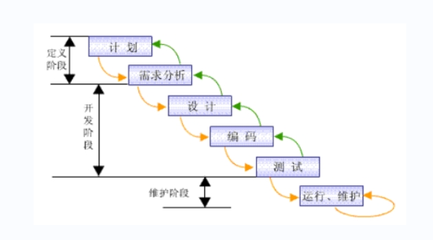 这种模式有明确的阶段活动,分为6个阶段:计划→需求分析→软件设计→编码→测试→运行维护。阶段顺序固定,自上而下、相互衔接,形如瀑布流水逐级下落。这也是瀑布模型名称的由来。