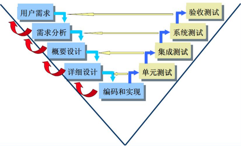 V模型也叫RAD(Rapid Application Development,快速应用开发)模型,是软件开发过程中的一个重要模型,由于其模型构图形似字母V,所以称为软件测试的V模型。V模型大体可以划分为以下几个不同的阶段步骤:客户需求分析、软件需求分析、概要设计、详细设计、软件编码、单元测试、集成测试、系统测试、验收测试。