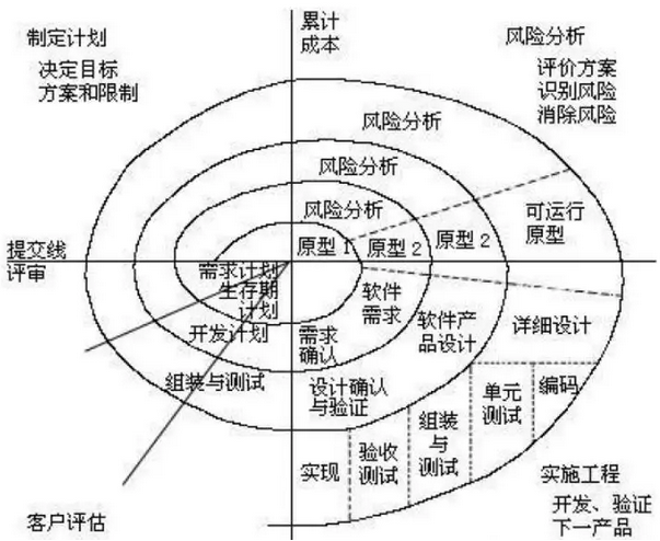 该模型融合了瀑布模型、快速原型模型,由巴利·玻姆(Barry Boehm)于1988年提岀,该模型最大的特点就是引入了其他模型所没有的风险分析。螺旋模型将开发过程分为几个螺旋周期,每个螺旋周期大致和瀑布模型相符合,在每个周期开始之前都会进行风险分析。在每个阶段,首先构建软件原型,根据快速原型模型完成这个迭代过程,产出最终完善的产品,然后进入下一个阶段,同样下一个阶段开始之前也要进行风险评估,这样循环往复直到完成所有阶段的任务。