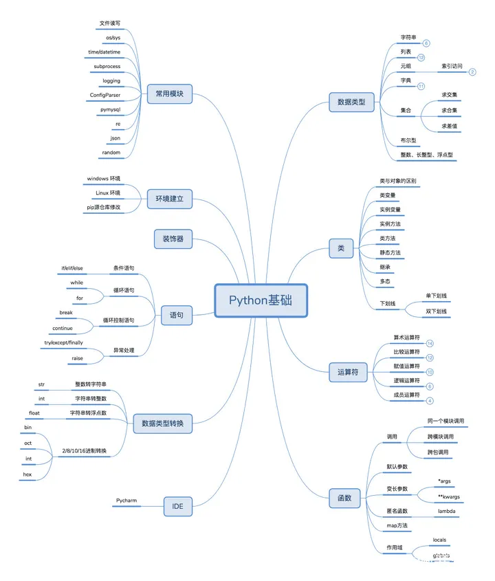 在学习的过程中,大家可以参考对照下面的 Python 知识图谱。这些技术点都是将来测试开发工作中经常用到的语言技能。