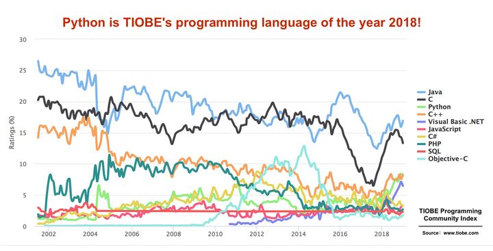 2019 新年伊始,Python 果然不负众望,以「AI 时代全栈语言」身份,轻松拿下全球知名的编程语言流行度排行榜网站 「TIOBE's 2018 年度编程语言」荣誉。相信等成功的 AI 应用和商业模式建立起来之后,市场对 Python 开发和测试技术人才的需求会有更加爆发性的增长。