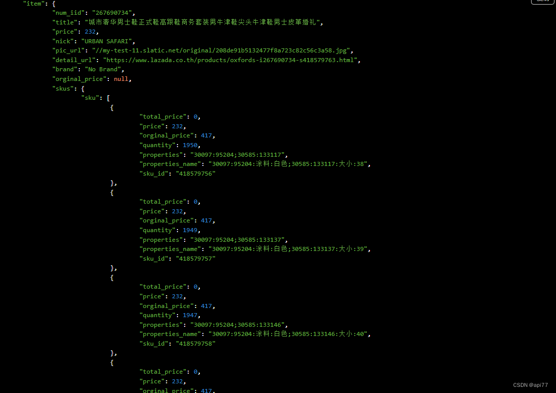 - 商品基本信息:API返回的JSON格式数据中,包含了商品的ID、名称、图片链接、价格等基本信息。这些信息对于商家来说,可以帮助他们了解市场需求和竞争态势;对于开发者来说,则可以基于这些信息构建更智能、更贴合用户需求的电商应用。