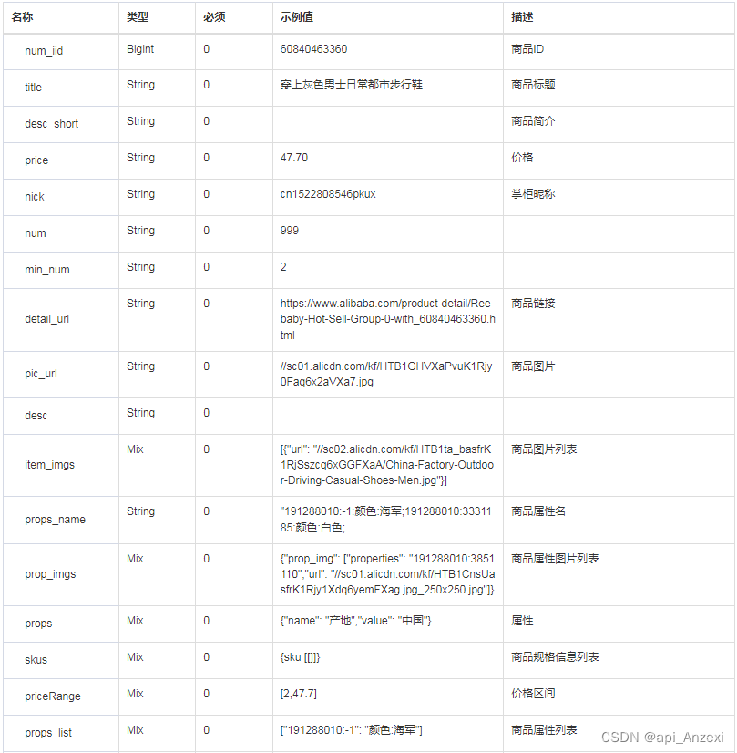 阿里巴巴获得商品详情 API 返回值说明 立即测试