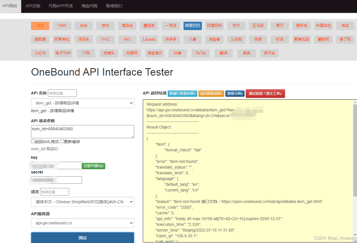 请求地址:https://console.open.onebound.cn/console/?i=Anzexi