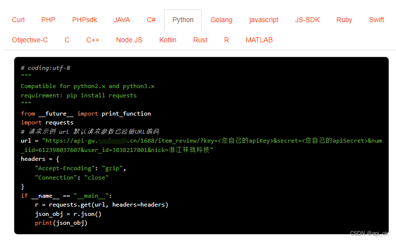 - 使用1688商品评论API接口的相应接口,向1688服务器发送请求并获取商品评论的数据。在请求中,需要将API Key、Secret Key以及其他必要的参数传递给API接口。
