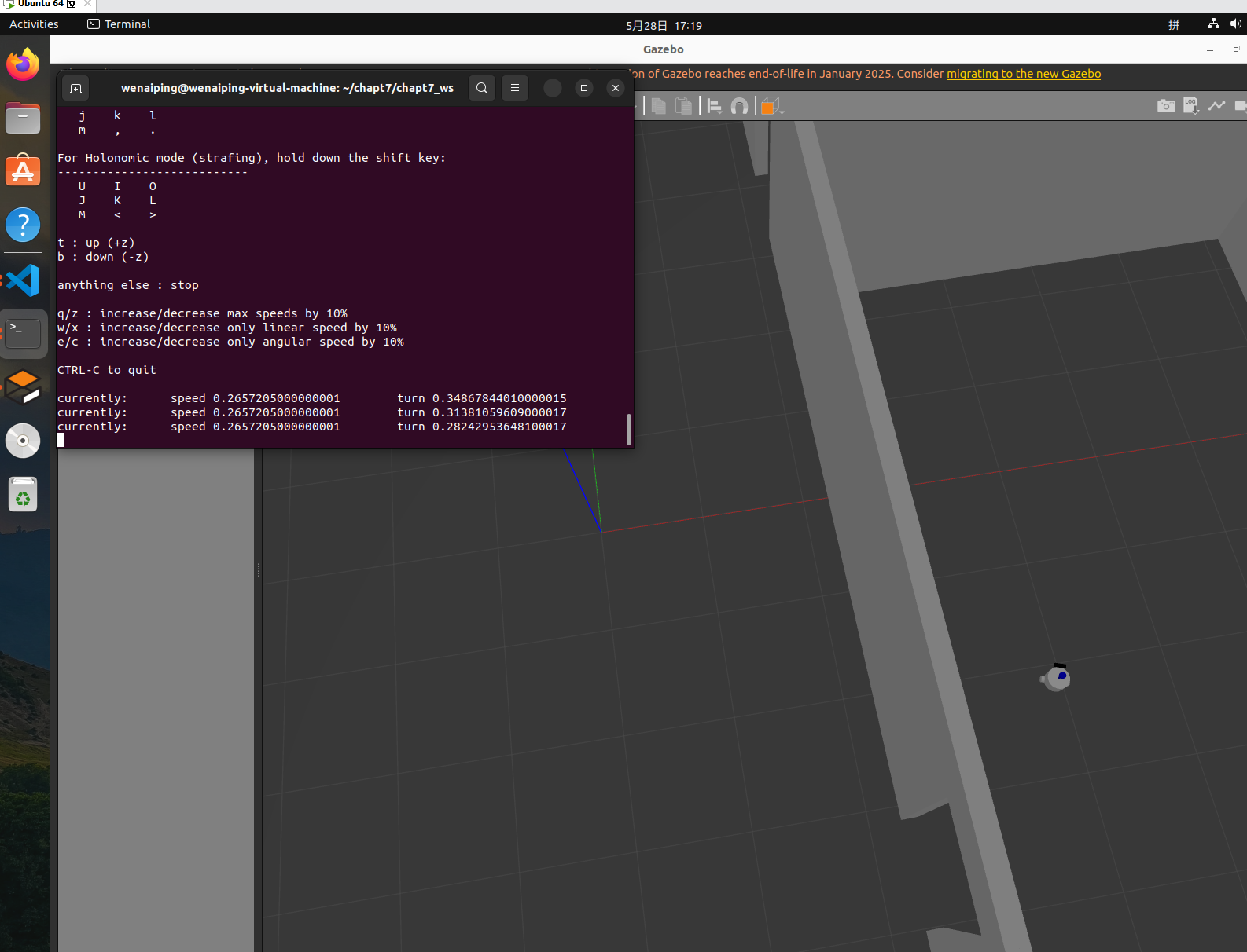 注意键盘控制节点的终端要和gazebo同时打开,回车启动键盘控制节点,按x键和c键减小机器人直线和转动的速度,按i键控制机器人前进,按m后退,k停止,j左转,l右转。这样你就可以控制机器人在你创建的房间中移动了,如果机器人移动效果不好,不平稳等需要调节轮子关节位置以及轮子的大小等参数。 如果机器人转动方向与键盘方向相反那么很可能是在机器人描述文件中你把机器人的轮子的位置设置反了,机器人的左轮在y轴的正反向,右轮在负方向。
