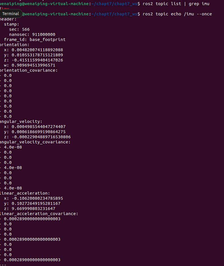 打印一次话题/imu的内容,仿真imu成功会输出类似以图片中的以下结果