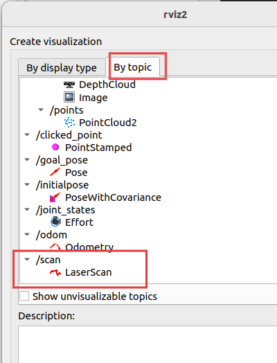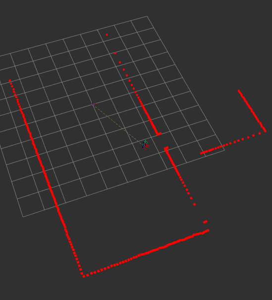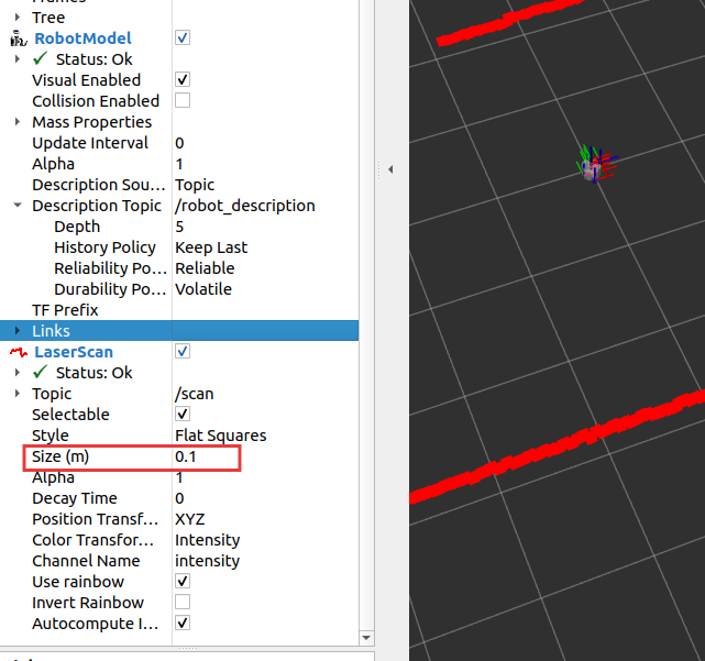 启动后点击左下角的Add添加选择By topic 选择/scan点击ok,时你的屏幕上就会显示很多小红点,勾勒出墙体大概的形状,这就是模拟的激光雷达采集的数据了。