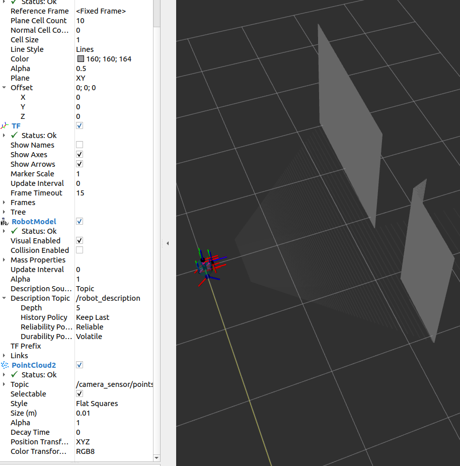 启动gazebo后再另一个终端中输入rviz2打开可视化工具,点击Add在By Tpoic下选择Point Cloud2点击ok,这时你的屏幕上就会出现深度图转换出来的点堆积出来的图像