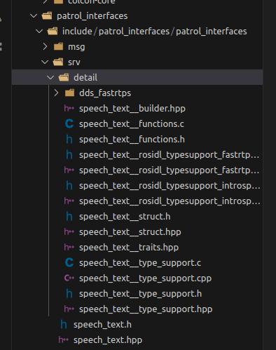 表明这是一个定义接口的功能包,编写好这些之后保存代码,并在工作空间下重新构建代码。构建完成后查看install/patrol_interfaces/include/patrol_interfaces/patrol_interfaces/srv/detail/dds_fastrtps$ 目录下如果构建无误,可以在该目录下生成以下文件: