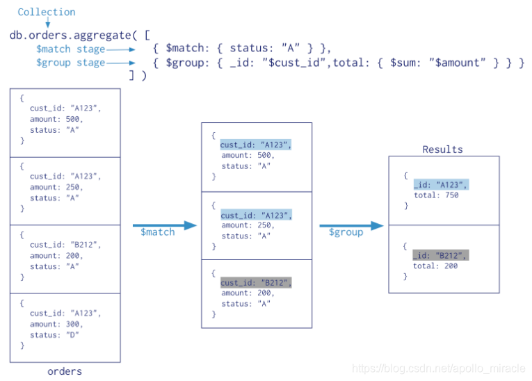 聚合(aggregate)是基于数据处理的聚合管道,每个文档通过一个由多个阶段(stage)组成的管道,可以对每个阶段的管道进行分组、过滤等功能,然后经过一系列的处理,输出相应的结果。