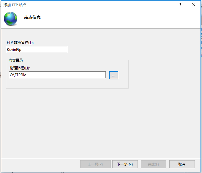 这里的FTP站点名称你随便起,物理路径为你要共享的文件夹。