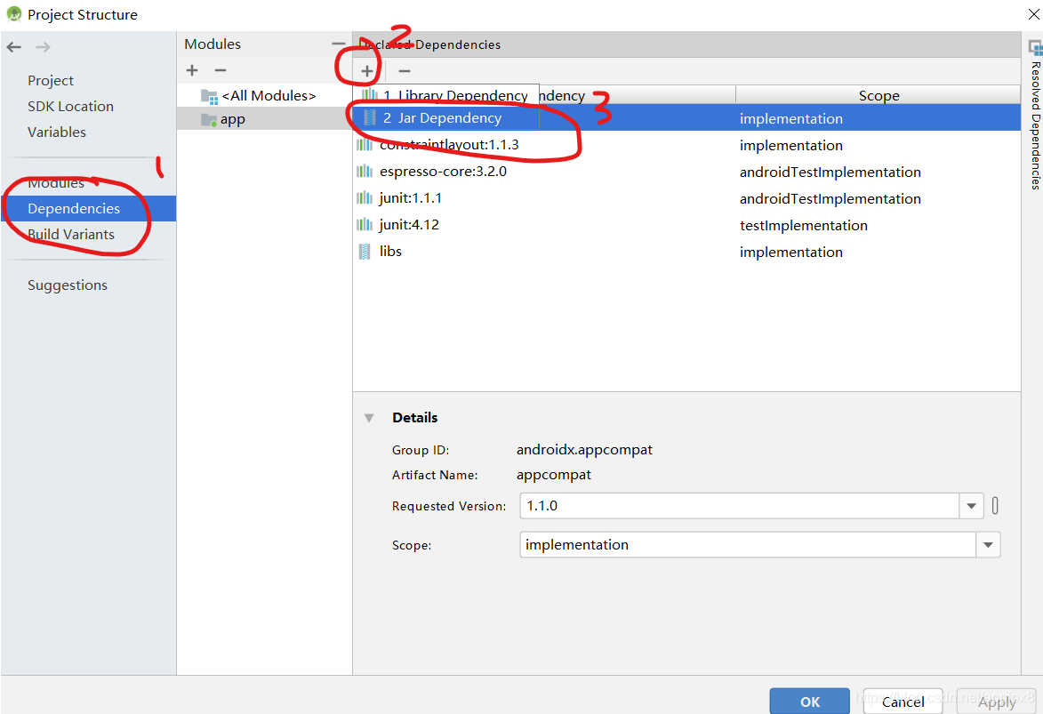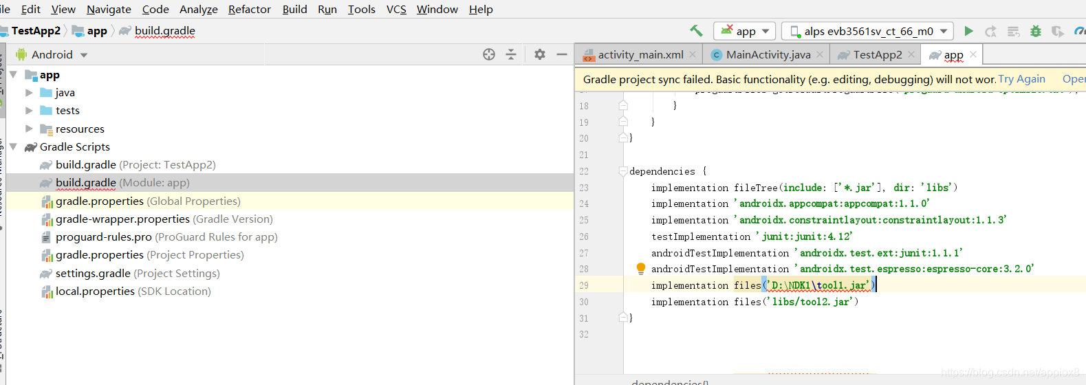 切换回android, 可以在build.gradle(Module:app)内看出两种添加的jar包,(将路径补正确)