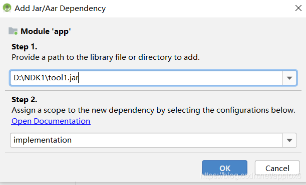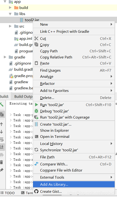 打开libs目录,将tool2.jar复制进去,然后右键选择add as a Library... , module选择app,然后确定。