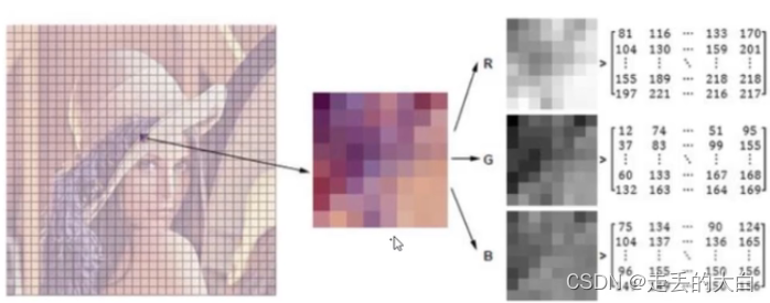 图像是由一个个点组成的,每一个像素点都可以分为3个通道R,G,B分别表示红,绿,蓝。每个通道由一个0-255的数值来表示。3个通道公同作用最后呈现出这个彩色的效果。(255,255,255为白色)如图: