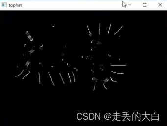 #礼帽 img = cv2.imread('H:\Peronal\dige.png') kernel = np.ones((5,5),np.uint8) tophat = cv2.morphologyEx(img,cv2.MORPH_TOPHAT,kernel) cv2.imshow('tophat',tophat) cv2.waitKey(0) cv2.destroyAllWindows() -