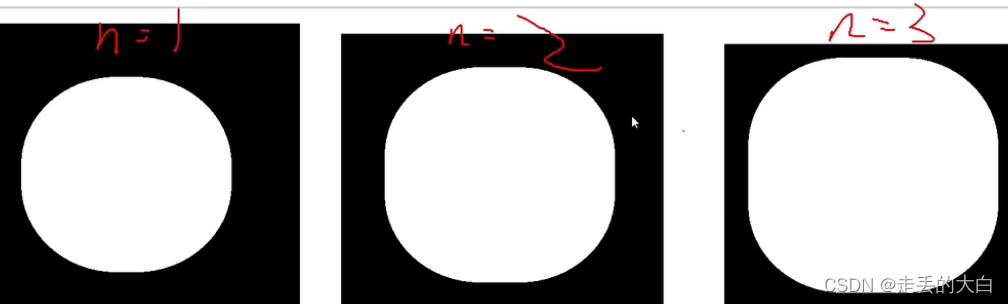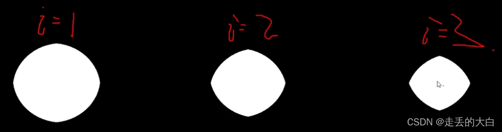 选择一个卷积核3x3,里面的设置不是很重要假设都是1。当使用这个核进行腐蚀的时候,如果中心点在圆形的中心,那么中心周围8个单元都是255,计算结果依然是255相当于没变化。