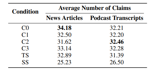 为提取事实性声明,我们使用了 Claimify 工具(Metropolitansky 与 Larson,2025)—— 这是一种基于大型语言模型(LLM)的方法,先识别回答中 “包含至少一个事实性声明的句子”,再将这些句子分解为简洁、独立的事实性声明。我们将 Claimify 应用于实验 1 各条件下生成的回答中。在移除每个回答中的重复声明后,共提取出 47,075 条独特声明,平均每个回答含 31 条声明。