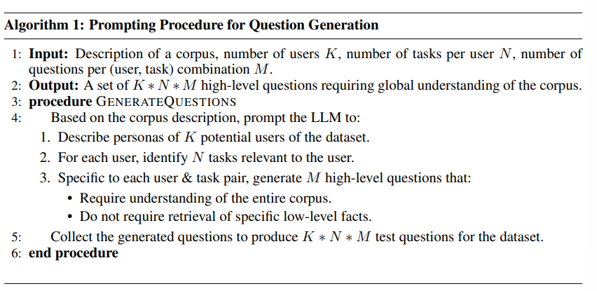 具体流程如下:首先向大型语言模型提供语料库的高层级描述及其用途,引导其生成该 RAG 系统的假设用户角色;接着,针对每个假设用户角色,引导大型语言模型明确该用户会使用 RAG 系统完成的任务;最后,针对每个 “用户 - 任务” 组合,引导大型语言模型生成需要理解整个语料库才能回答的问题。相关方法详见算法 1。